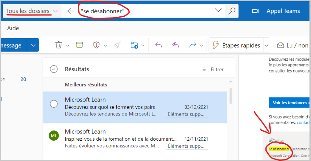 - Taper “se désabonner” dans la barre de recherche de votre boîte mail et cliquez sur tous les liens de désabonnement