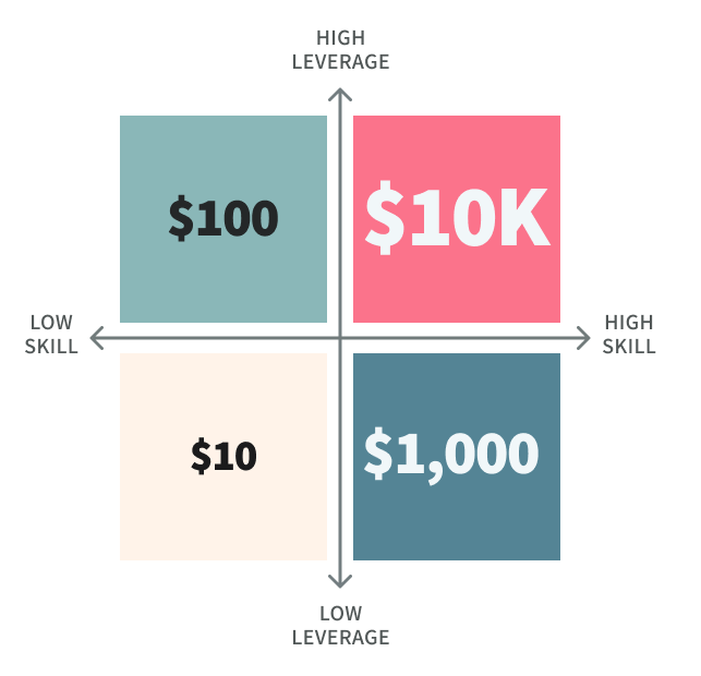 Le travail à 10 $/heure est celui qui ne fait pas avancer les choses, comme le piratage des cartes de crédit ou la gestion des e-mails. C'est un travail qui ne nécessite pas beaucoup de compétences a peu de levier. Il procure une sensation de productivité et de satisfaction immédiate, mais il n'a pas d'impact à long terme