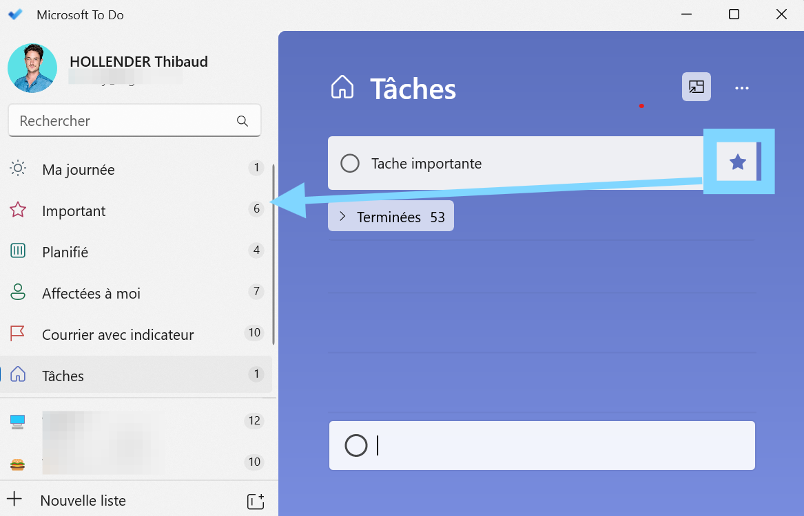 A côté de chaque tâche figure une petite étoile. En cochant cette petite étoile, vous avez un premier niveau de distinction entre les tâches importantes et le reste. Elles apparaîtront automatiquement dans la liste “Tâches importantes”.