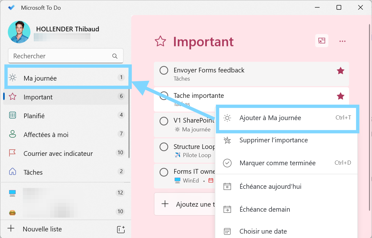 ✅ Allez dans la liste des tâches importante et UNIQUEMENT depuis cette liste, faites clic droit > Ajouter à ma journée pour les tâches que vous voulez réaliser aujourd’hui. Sélectionnez en 3.